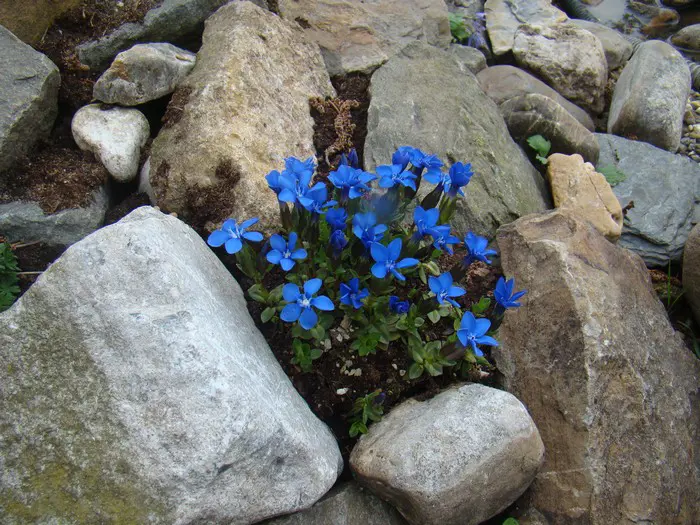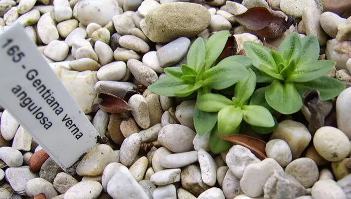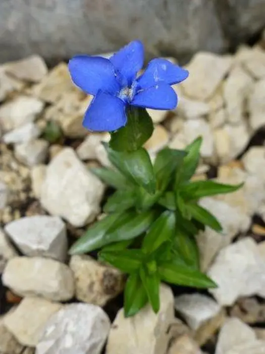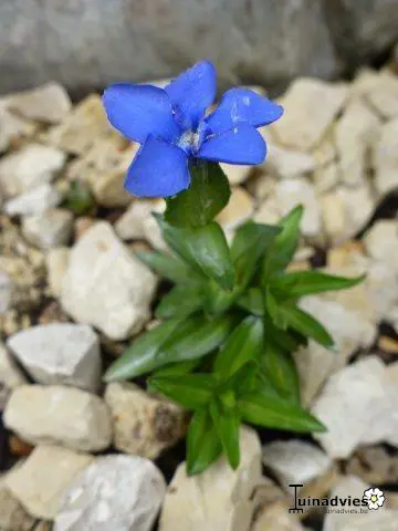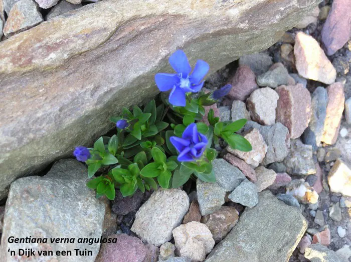 Gentiana verna 'Angulosa' ist eine kompakte, mattenbildende Pflanze mit Rosetten, die von schmalen ovalen bis lanzettförmigen, dunkelgrünen Blättern reichen.