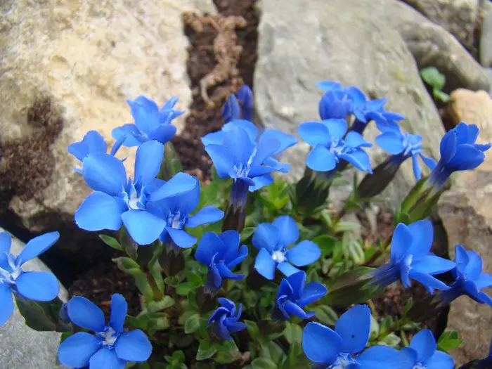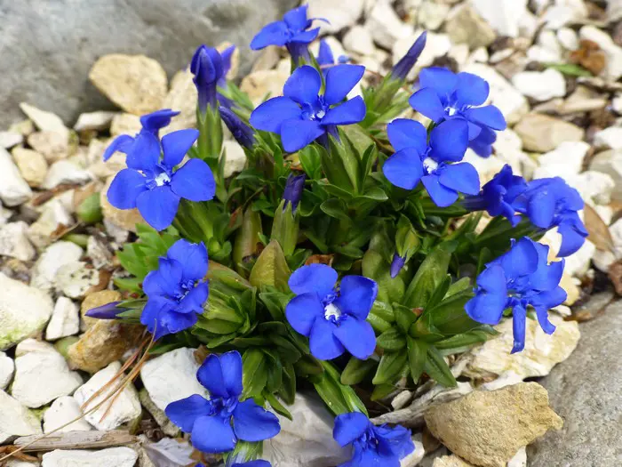 Die sternförmigen, tiefblauen Blüten blühen an kurzen Stängeln.