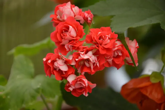 Pelargonium 'Red Rambler' blüht mit doppelten Blüten, die kleinen Rosen ähneln.