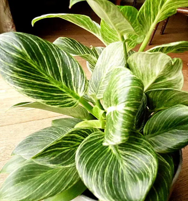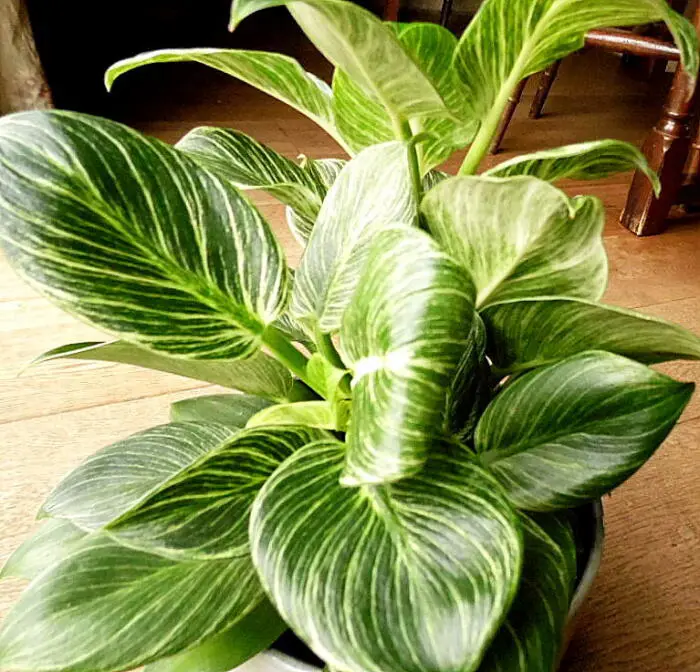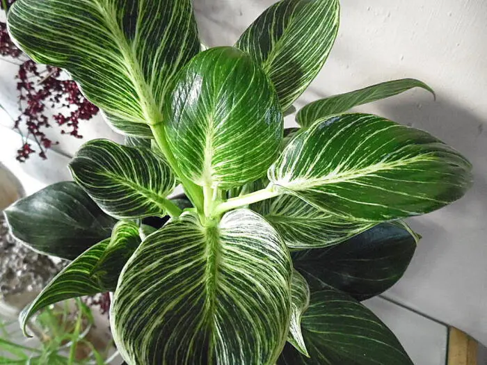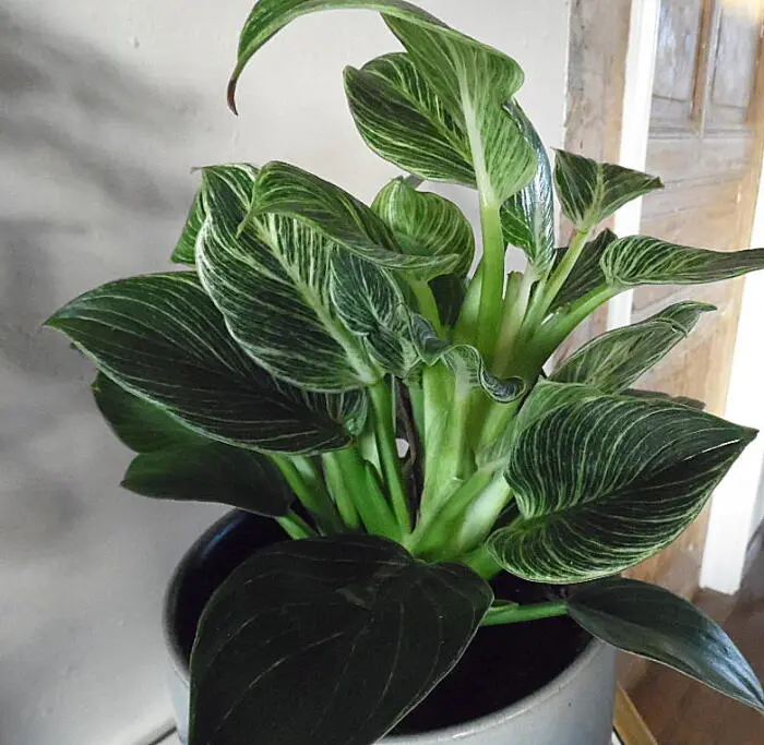 Philodendron 'Birkin' ist eine einfache Zimmerpflanze mit einem geraden, buschigen Wachstum und feinen hellgrünen Nadelstreifen auf dunkelgrünen, glänzenden Blättern. Die neuen Blätter sind heller gefärbt und werden mit dem Alter grün.