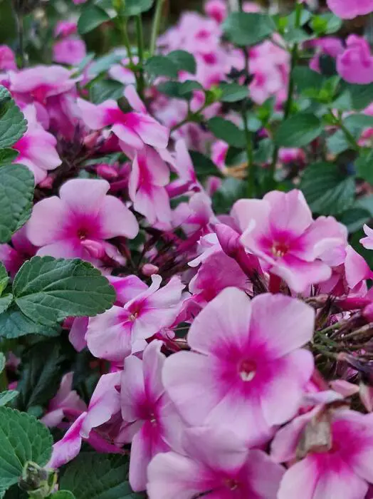 Phlox 'Sweet Summer 'Festival' blüht rosa mit einem dunklen magentafarbenen Auge.