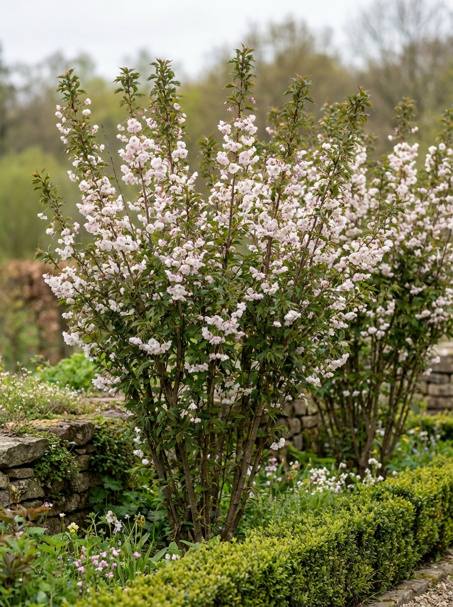Prunus incisa 'Oshidori' blüht mit rosa doppelblütigen Blüten.