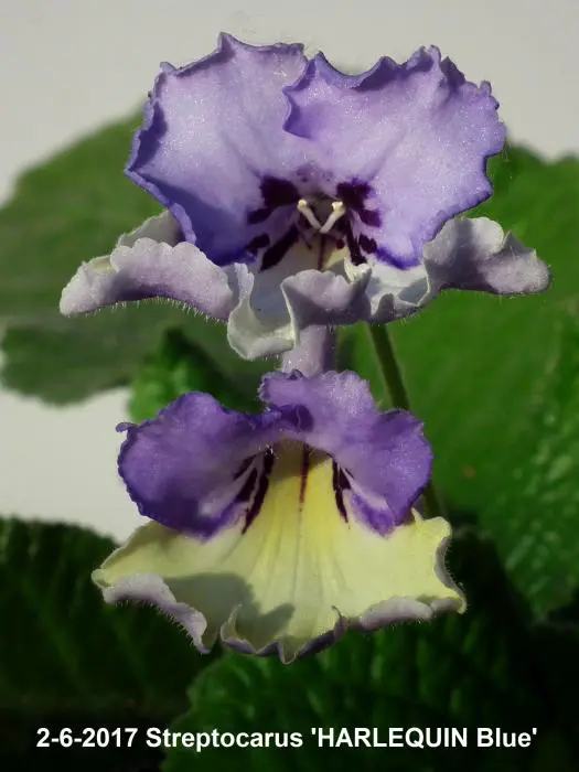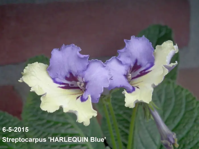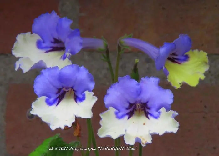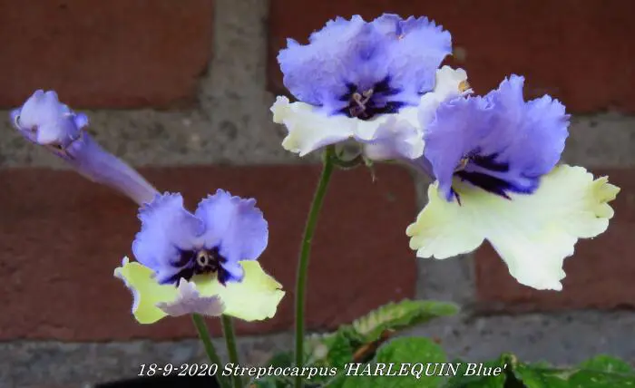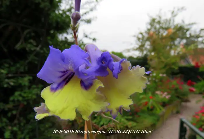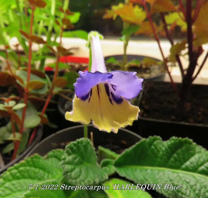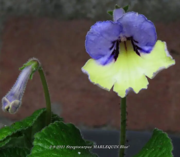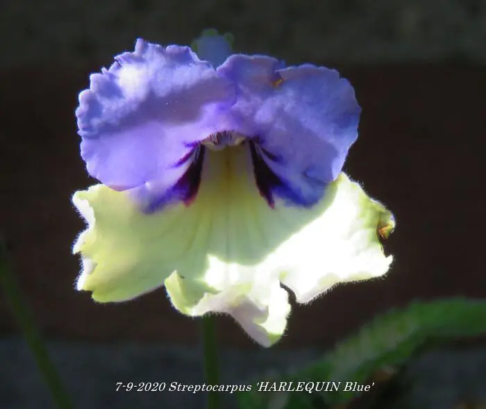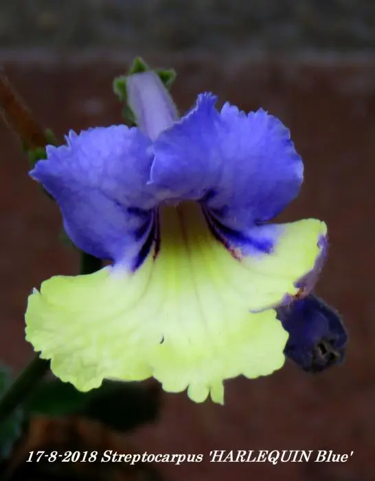 Streptocarpus 'Harlequin Blue' blüht blau mit gelb.