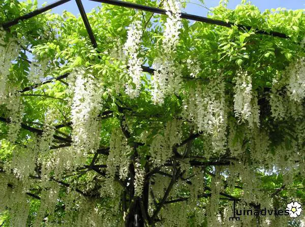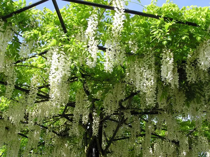 Wisteria floribunda 'Shiro-noda' ist eine japanische Wisteria mit rechts gewickelten Ranken (im Uhrzeigersinn) und blüht mit langen weißen Blütentrauben von bis zu 60 cm Länge.