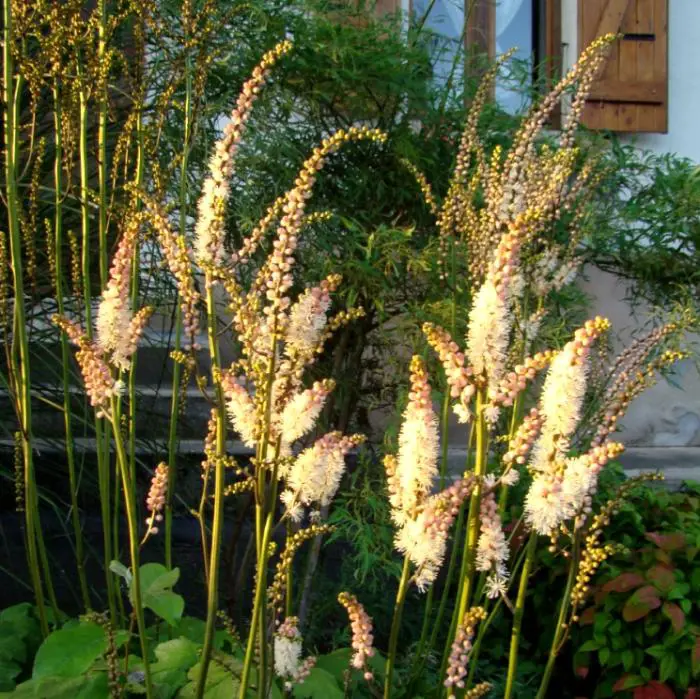 Actaea japonica 'Silver Dance' ist eine kompakte Sorte mit einem wunderbar gelobten, silber-glänzenden Blatt im Frühling und einer brillanten Blüte im September. Die Blüte ist sehr reich und luftig mit schlanken Ässeln, die mit einer Fülle cremig-weißer, duftender Blüten aus rosa Knospen bedeckt sind.