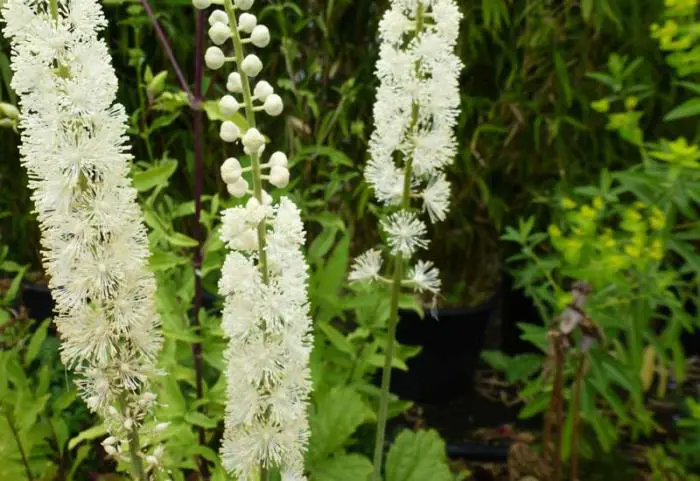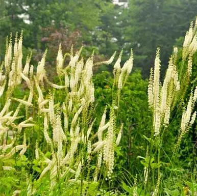 Actaea racemosa ist eine mehrjährige Waldpflanze aus Nordamerika mit frischen, grünen, gefiederten Blättern und langen, verzweigten Stängeln, auf denen cremig-weiße, duftende Blütenspitzen blühen.