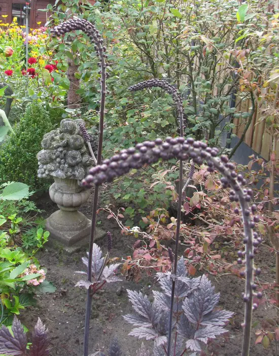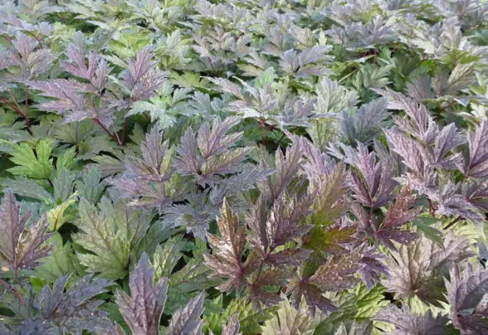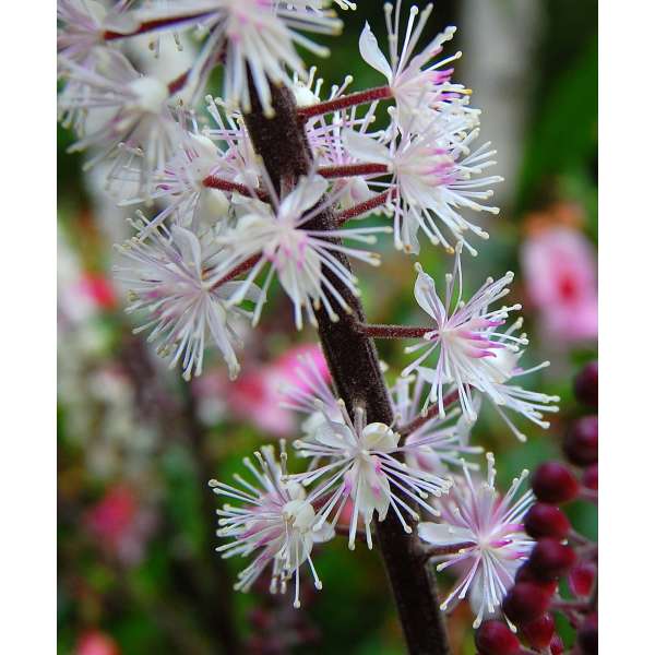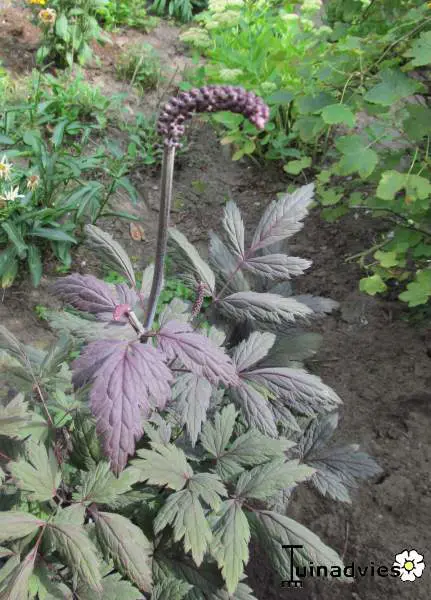 Actaea simplex 'Pink Spike' hat beim ersten Erscheinen ein ziemlich dunkles purpurgrünes Blatt, aber weniger dunkel als das von 'Brunette'. Die Blätter bleiben bis zum Herbst dunkel.