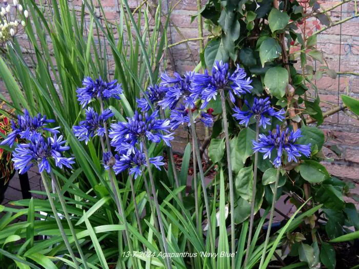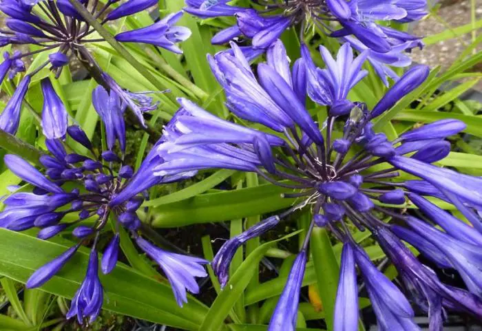 Agapanthus 'Navy Blue' hat gürtelförmige Blätter und blüht üppig mit runden Dolden aus intensiv dunkelblauen, trompetenförmigen Blüten an kräftigen violett-grünen Stängeln.