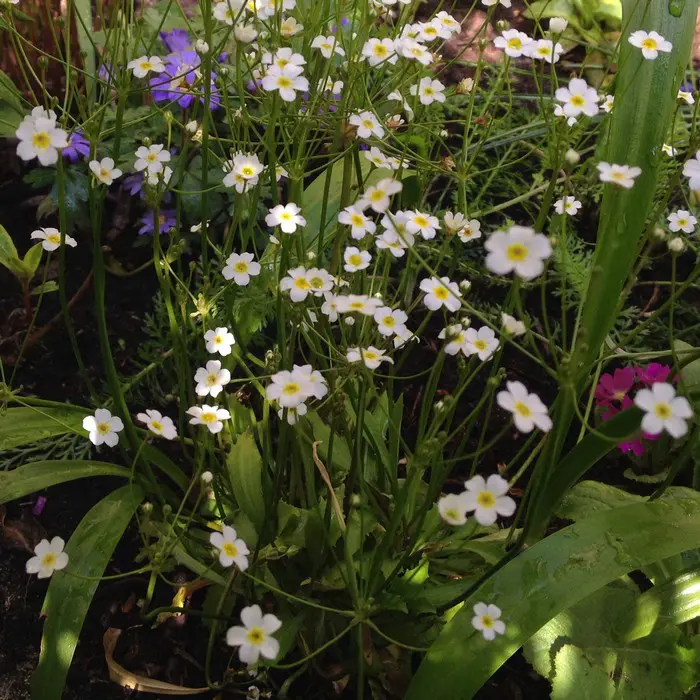 Androsace septentrionalis 'Stardust' bildet eine Rosette aus dunkelgrau-grünen Blättern mit umbelartigen weißen Blüten und einem grünlich-gelben Auge an langen Stängeln.