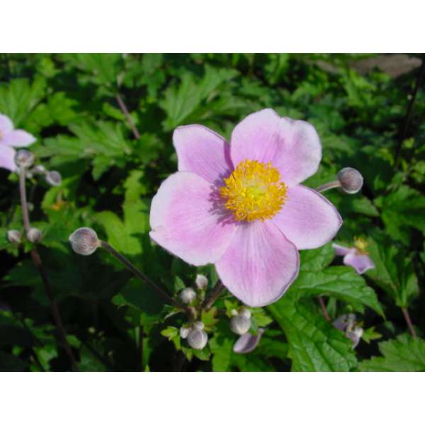 Blüht im Herbst mit einer Fülle großer, einzelner, perlmuttrosa Blüten mit langen goldgelben Staubblättern.