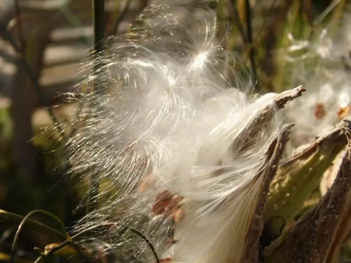Die Papageienpflanze verdankt ihren Namen der Form der Frucht; Dies erinnert am meisten an einen Papagei, der kopfüber mit dem Schnabel am Stängel verbunden ist. Die Frucht reißt nach der Reifung auf und es entstehen viele Fluffmasse.