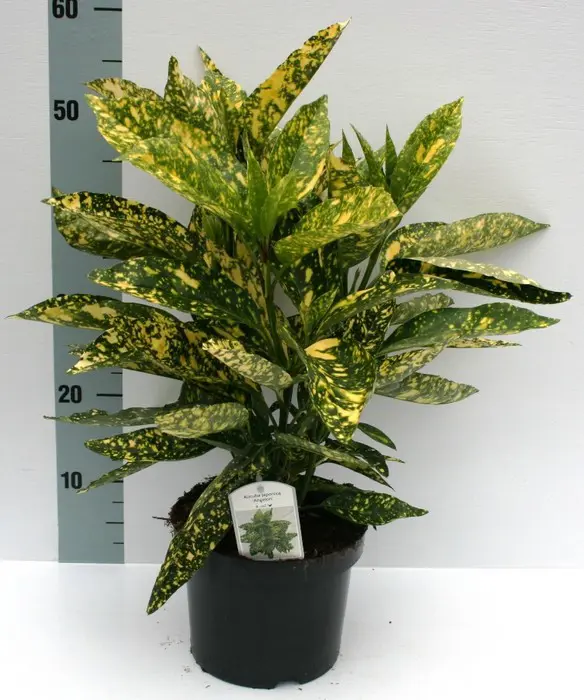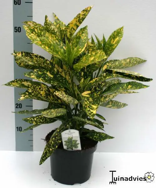 Aucuba japonica 'Angelon' hat ledrige, gelb gefleckte Blätter.