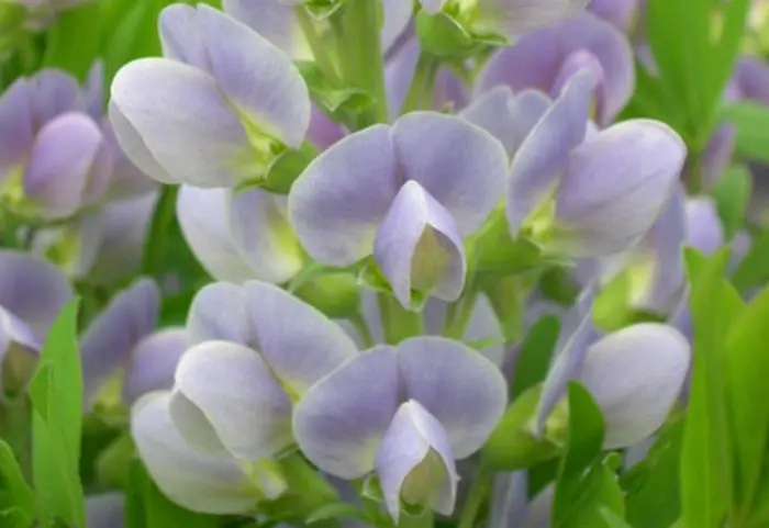 Baptisia 'Starlite Prärieblues' ist eine sehr schöne Sorte, etwas weniger hoch, aber mit schönen eisblauen Blüten und einem Hauch von Gelb.