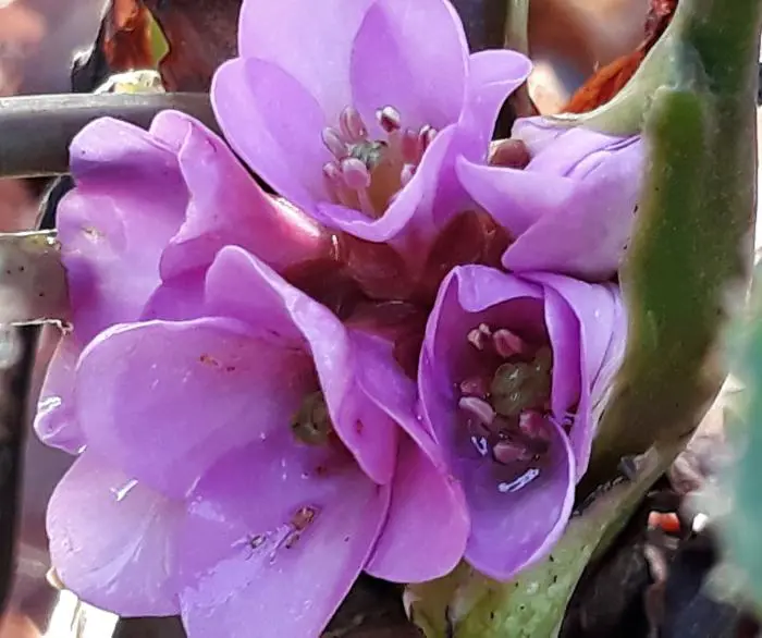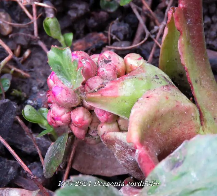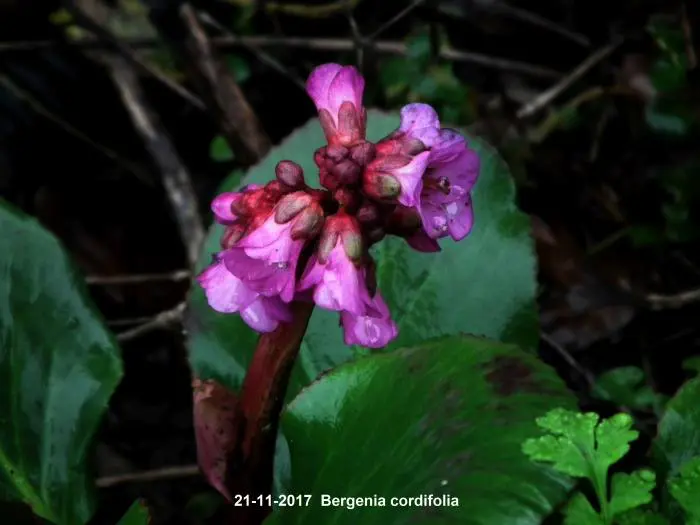 Diese kriechende, rhizomatöse Pflanze hat große, ledrige grüne Blätter. Sie werden rot/lila-grün, sobald die Nächte kälter werden, und bleiben dann den ganzen Winter an der Pflanze. Im Frühling kannst du dann die hässlichen Blätter herausziehen.