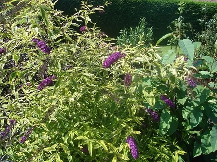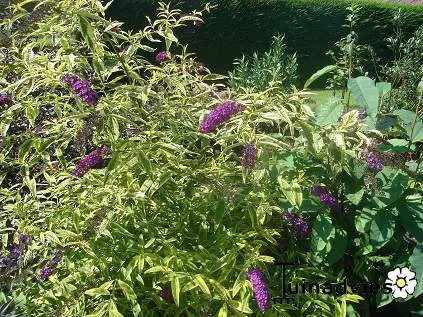 Buddleja davidii 'Santana' ist ein Schmetterlingsstrauch mit gelb-grünen, bunten Blättern und fliederfarbenen Blütenfedern.