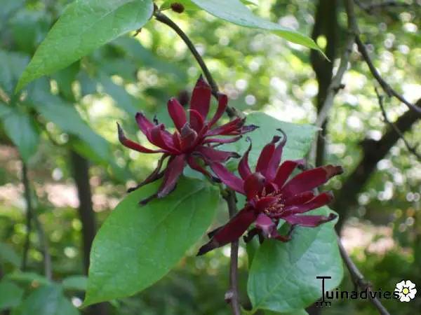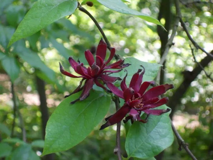 Calycanthus ist ein Baum oder ein Strauch mit bemerkenswert duftenden Blüten in Form einer kleinen Seerose. Sie blühen braun-rot, magenta oder weiß.