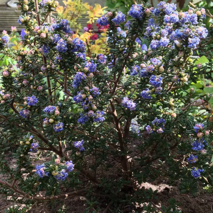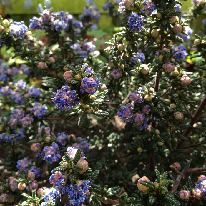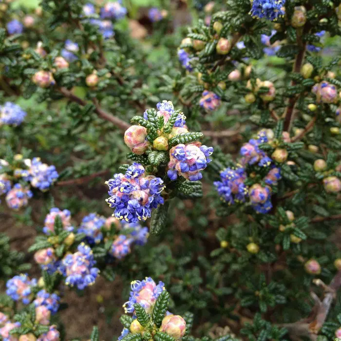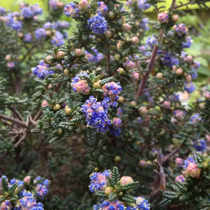 Ceanothus 'Pin Cushion' ist ein runder, breiter Strauch mit kleinen ovalen, glänzend dunkelgrünen Blättern und Büscheln intensiv blauer Blüten.