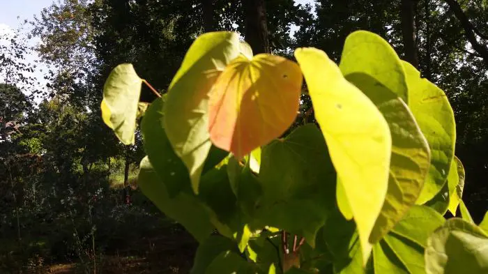 Die Blätter sind herzförmig und haben im Laufe der Jahreszeiten eine schöne Verfärbung. Im Frühling tiefes Orange zu Gelb-Orange zu Gelb, im Sommer von leuchtendem Grün und endet im Herbst mit Rot-Orange.