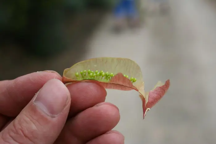 Nach der Blüte erscheinen die auffälligen, blasenförmigen Früchte. Wenn man auf so einen Beutel drückt, springt er auf.