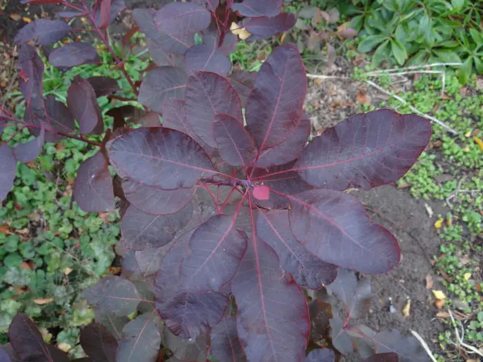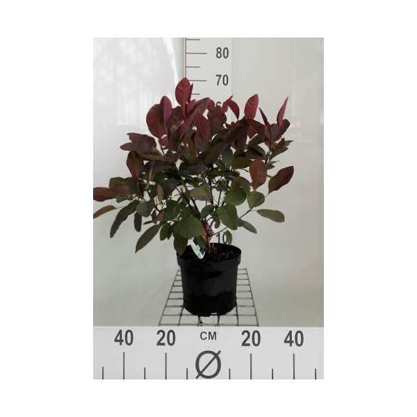 Es handelt sich um einen attraktiven Strauch/kleinen Baum mit runden Blättern, die weinrot sprießen und im Sommer zu dunkelrot-blau und im Herbst zu leuchtendem Orange-Rot wechseln.