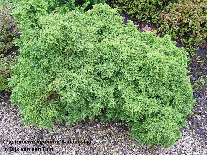 Cryptomeria japonica 'Bandai-sugi' ist eine langsam wachsende Nadelbaum mit unregelmäßiger Rundform. Die Nadeln sind kurz und nehmen im Winter einen bronzeähnlichen Farbton an.