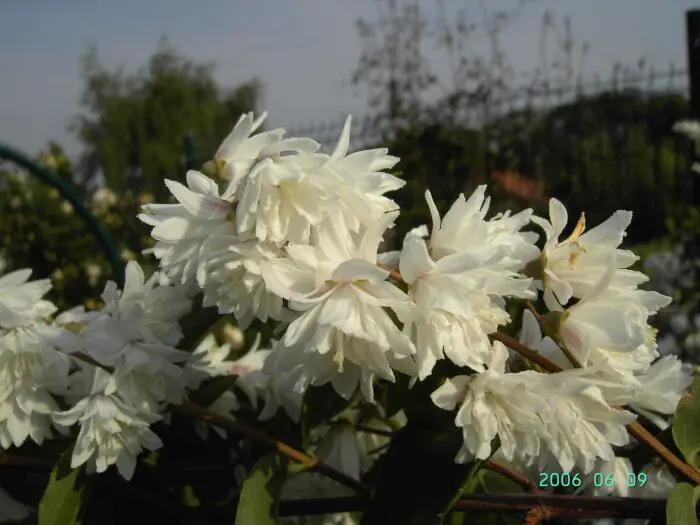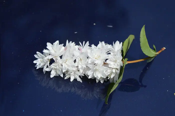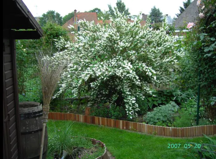 Deutzia scabra hat eine aufrechte Haltung, später mit hängenden Ästen und dunkelgrünen, rauen und behaarten Blättern.