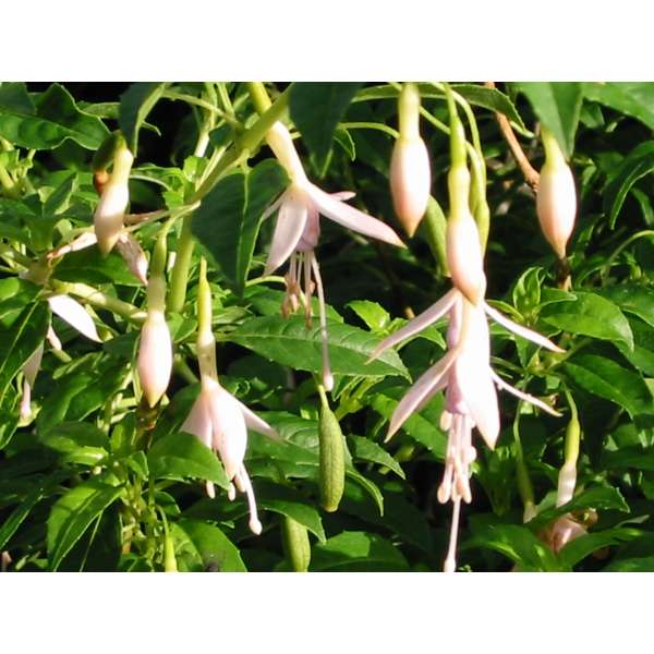 Fuchsia magellanica var molinae ist eine aufrechte Pflanze mit überhängenden Zweigen.