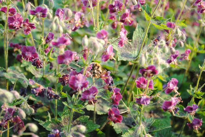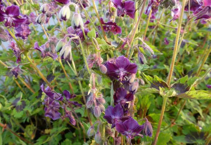 Geranium phaeum 'Samobor' blüht im Frühling mit zahlreichen kleinen, purgranatfarbenen Blüten, die in Büscheln hoch über dem Laub getragen werden.