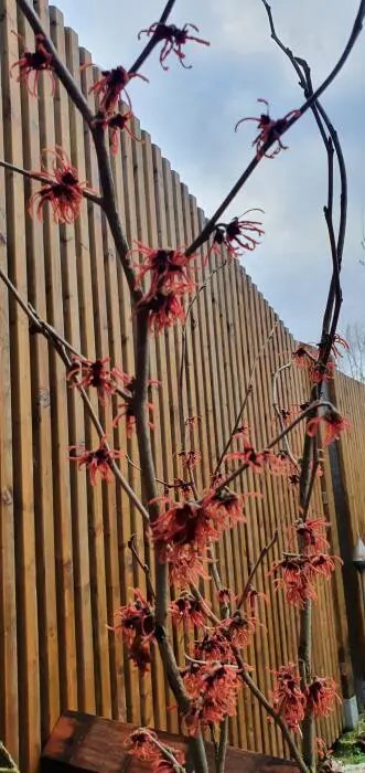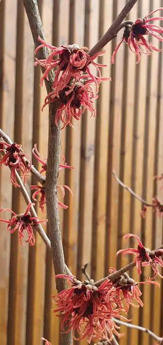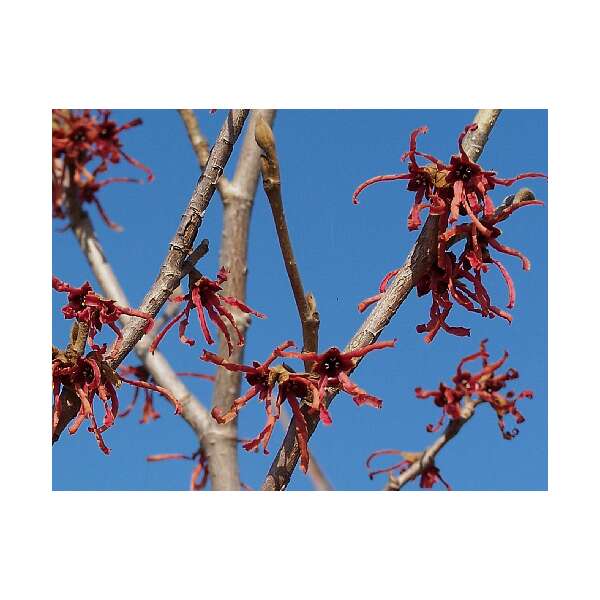 Hamamelis x intermedia 'Ruby Glow' ist ein aufrechter Strauch mit einer ganz besonderen Blüte. Hellt die Saison mit Büscheln leicht duftender, bräunlich-roter Fäden auf den nackten Ästen auf.
