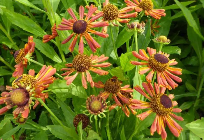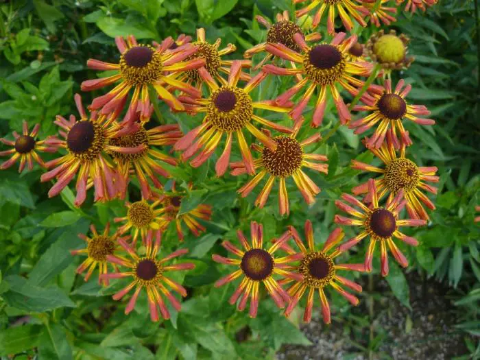 Helenium 'Loysder Wieck' blüht mit großen, originalen Blüten mit gerollten Blütenblättern, oben gelb und auf der Rückseite feurig rötlich-braun.
