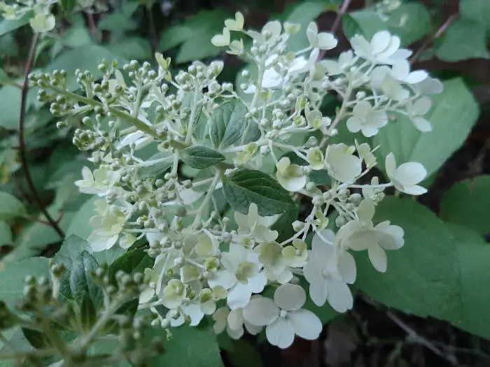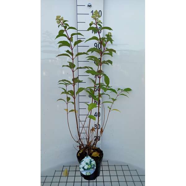 Hydrangea paniculata 'Diamantino' ist ein aufrecht wachsender Strauch mit großen, federförmigen gelb/grünen Federn, die bis Anfang September leuchtend weiß werden und schließlich rosa blühen.