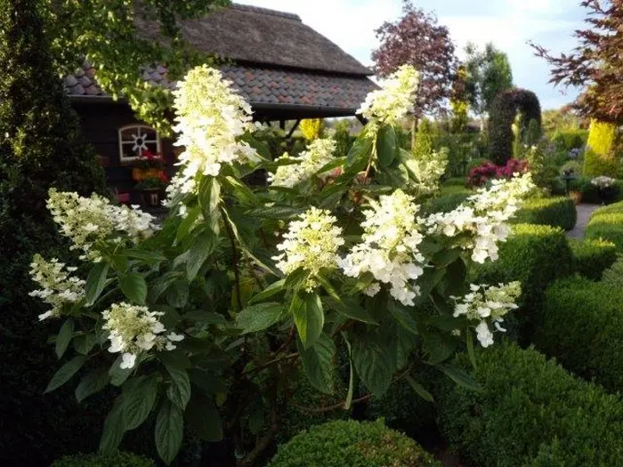 Hydrangea paniculata 'Floribunda' blüht mit cremeweißen, großen Blütenrispen steriler Randblüten.