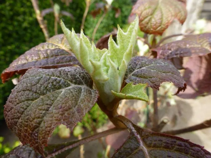 Die Blätter der Hydrangea quercifolia 'Burgundy' haben die Form eines Eichenblatts und nehmen eine wunderschöne weinrote Herbstfarbe an.