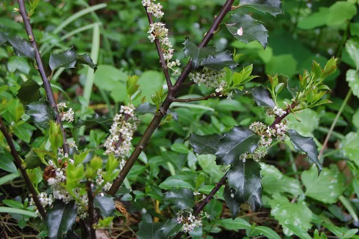 Ilex meserveae 'Blue Princess' ist ein Strauch mit violetten Ästen und sehr stacheligen, ovalen, glänzend dunkelgrünen Blättern.