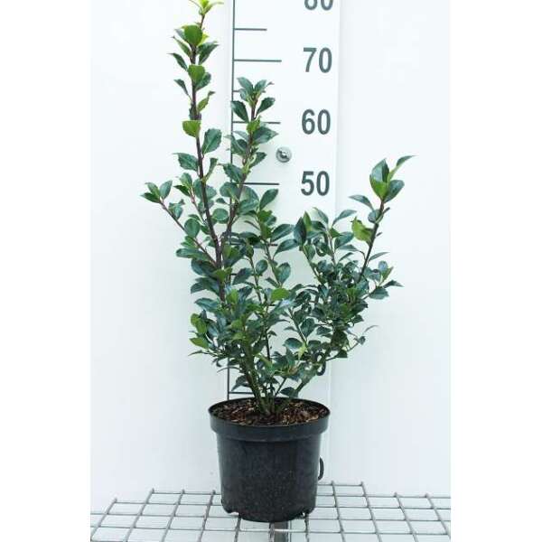 Ilex x meserveae 'Heckenfee' ist ein aufrecht wachsender, dichter Strauch mit violettroten Ästen und glänzenden, tiefgrünen Blättern, fein gezähmt, ohne stachelnd zu sein.