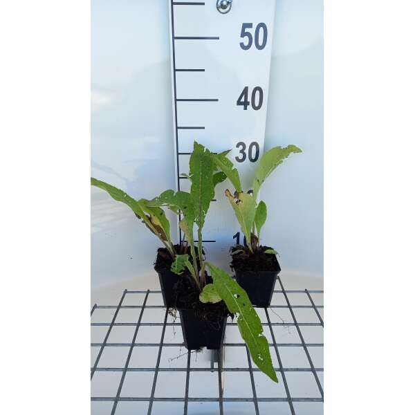 Hat große, zähneige, schmale lanzettförmige Blätter, weiß behaart an der Unterseite.