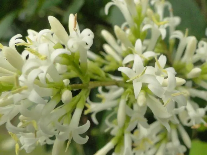 Ligustrum ovalifolium blüht mit duftenden weißen Blüten, gefolgt von schwarzen Beeren; sofern sie nicht als Hecke geschnitten werden, blühen sie nicht.