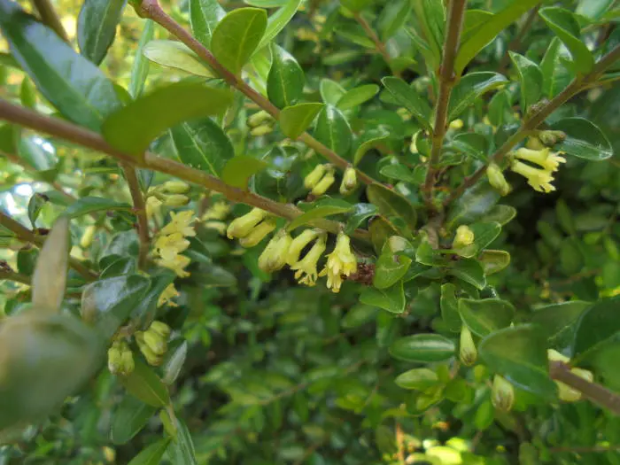 Lonicera nitida 'Elegant' ist ein langsam wachsendes Strauch-Geißblatt mit einem breiten, aufrechten Wuchsmuster und ovalen, glänzenden dunkelgrünen Blättern.