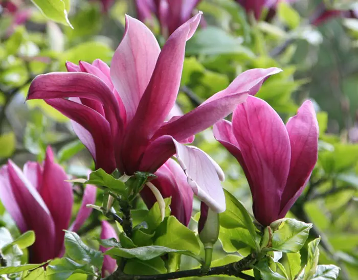 Magnolia liliiflora 'Nigra' ist ein langsam und breit wachsender, buschiger mehrstämmiger Baum.