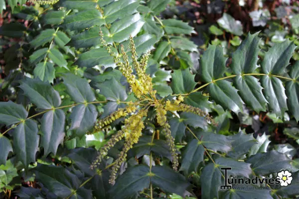 Mahonia japonica bildet einen Strauch aus glänzenden, dunkelgrünen, gefierterten Blättern, deren Ränder wellig und stachelig sind. Im Herbst wird er rot.