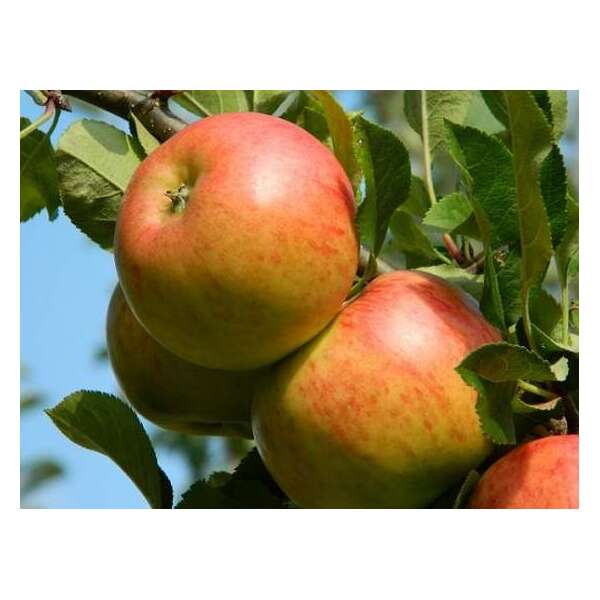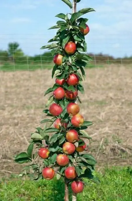 Malus ballerina 'Red Sensation' ist ein sehr schmaler, säulenförmiger Apfelbaum. Er bildet nur etwa 20 cm breite horizontale Äste und die Äpfel wachsen fast am Stamm.