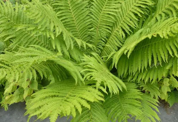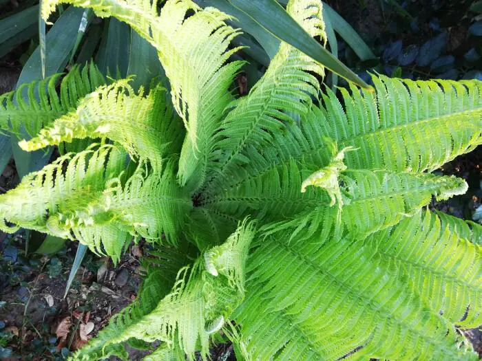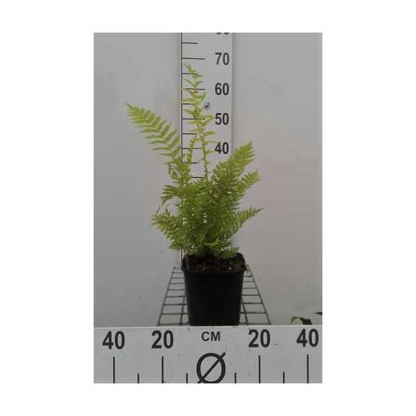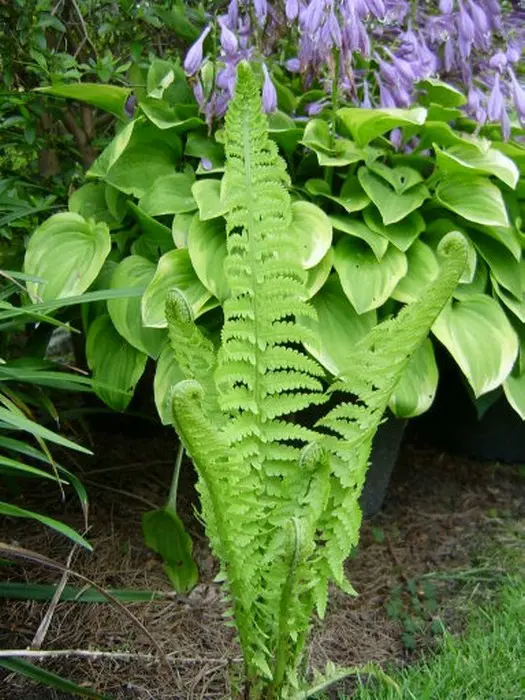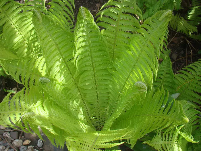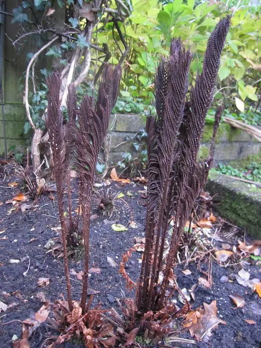 Die Federn ähneln dem männlichen Farn, stehen aber aufrecht in Bündeln, leicht gebogen wie Straußenfedern.