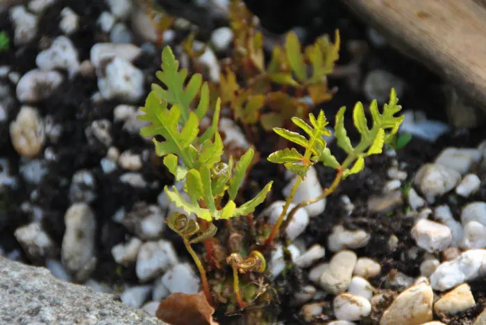 Die Blätter sind hellgrün und doppelt befiedert auf langen Stängeln.