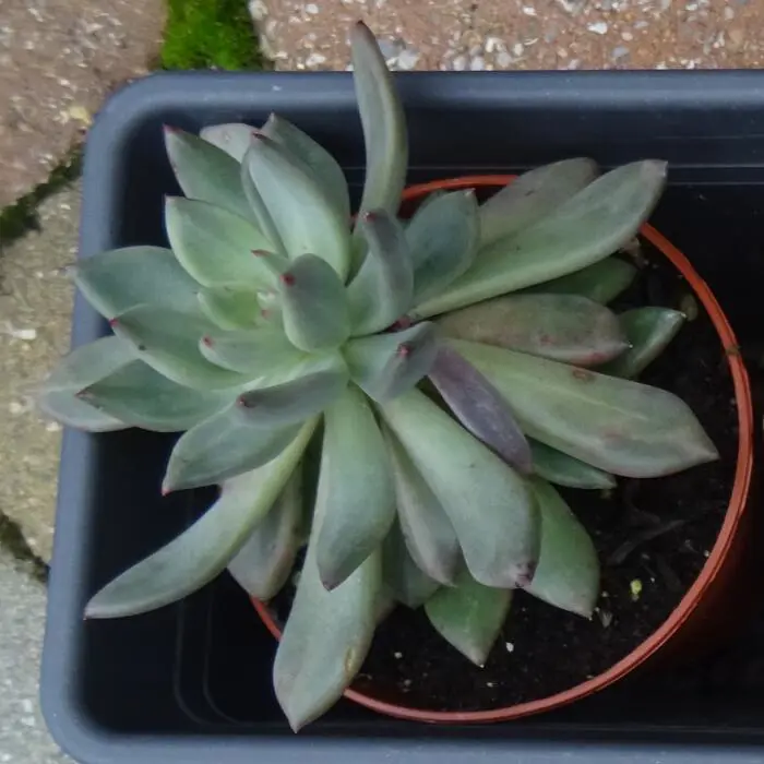 Es handelt sich um eine sukkulente Pflanze mit Rosetten aus vollen, dicken, silbergrünen Blättern mit manchmal einem violetten bis fliederfarbenen Rouge und bedeckt mit einer pudrigen weißen Wachsschicht (Farina). Dies ist eine natürliche Form des Schutzes und sollte nicht abgewischt werden.