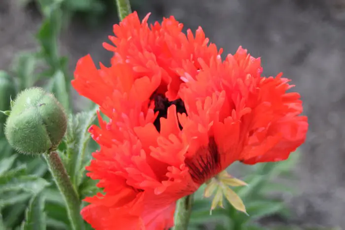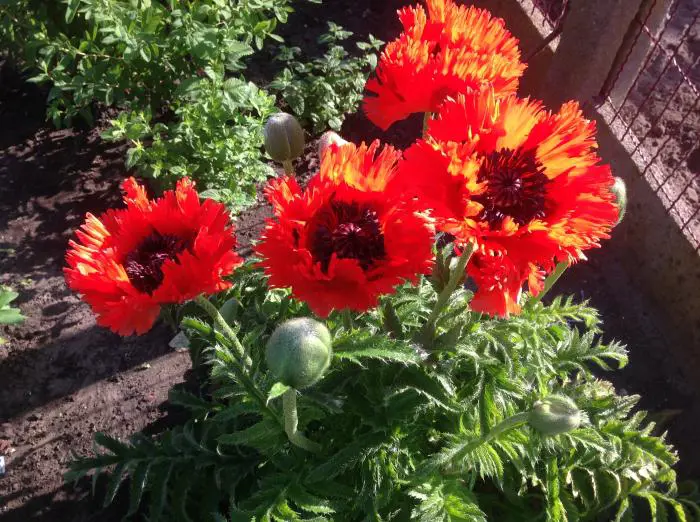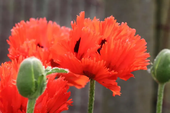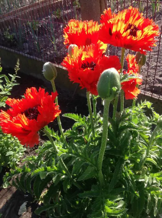 Blüten auf aufrechten, behaarten Stängeln mit großen, papierartigen, gefransten, leuchtend roten Blüten mit schwarzen Flecken in der Mitte.