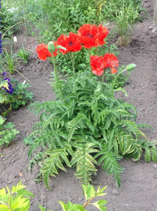 Papaver orientale 'Türkenlouis' ist eine aufrechte Staude mit fein geteilten, rauhaarigen, graugrünen Blättern.