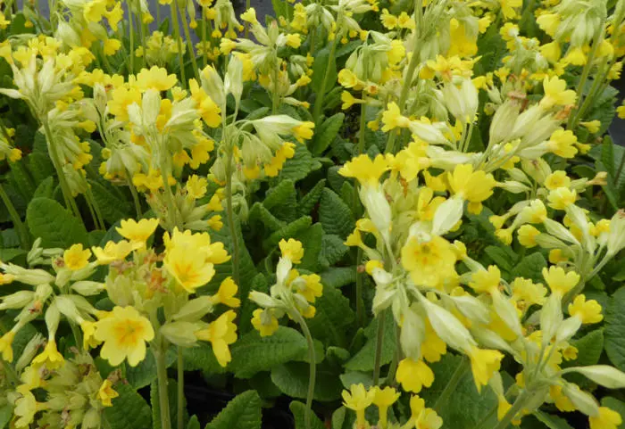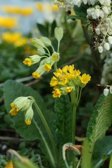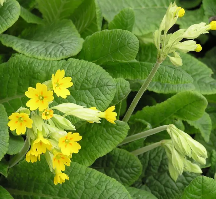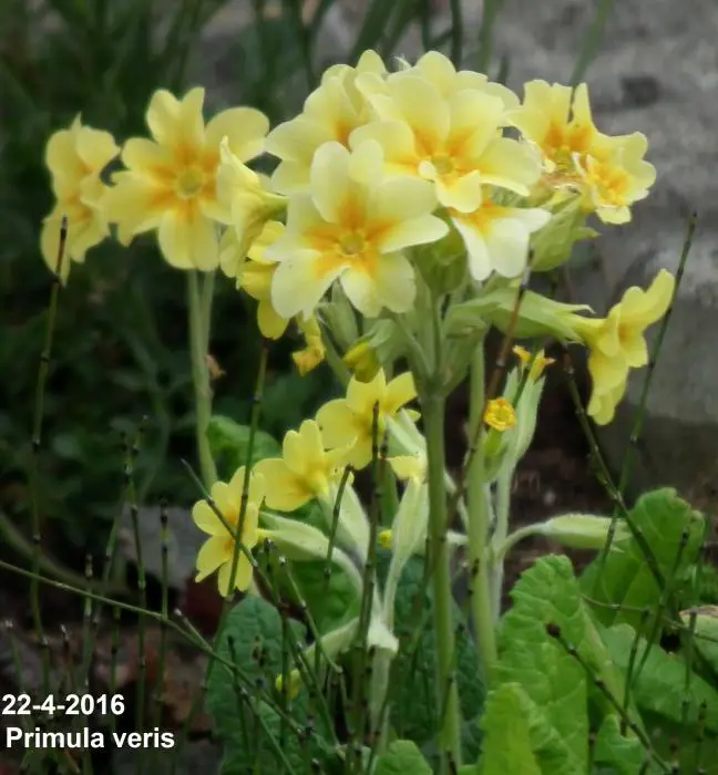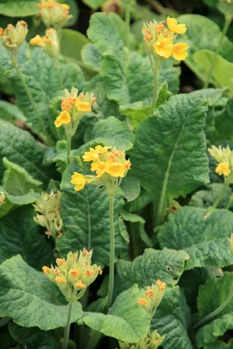 Gelbe, glockenförmige Blüten mit 5 orangefarbenen Flecken im Hals.