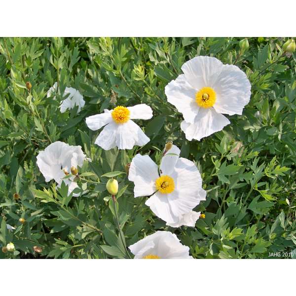 Romneya coulteri blüht mit großen, duftenden Blüten, die silbrig-weißen Mohnblumen ähneln, mit einem auffallend großen goldgelben Herzen und zerknitterten, papierartigen Blütenblättern.