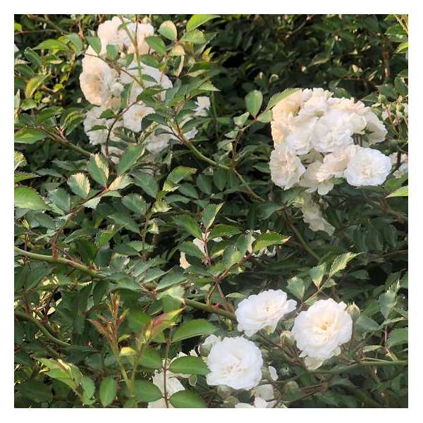 Rosa 'Alba Meidiland' ist eine durchgehend blühende Rose mit Büscheln gut gefüllter kleiner weißer Blüten.