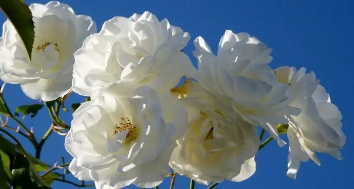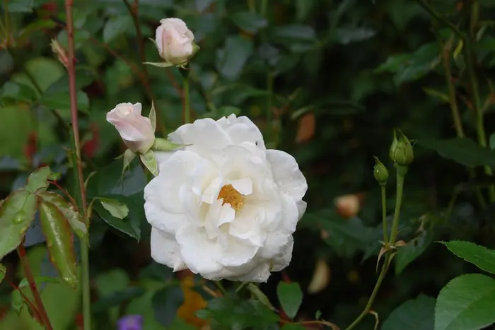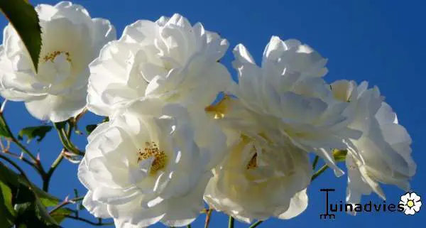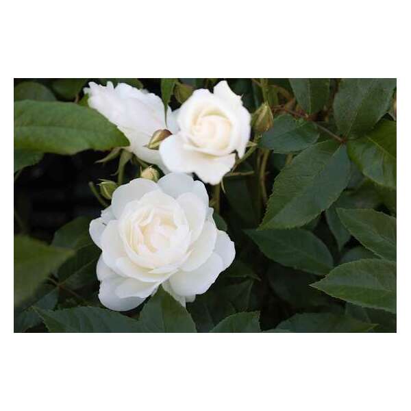 Diese kräftige Rose blüht mit strahlend weißen Blüten, bekommt aber im Spätsommer durch die kälteren Nächte rosa-rote Flecken auf den Blütenblättern.